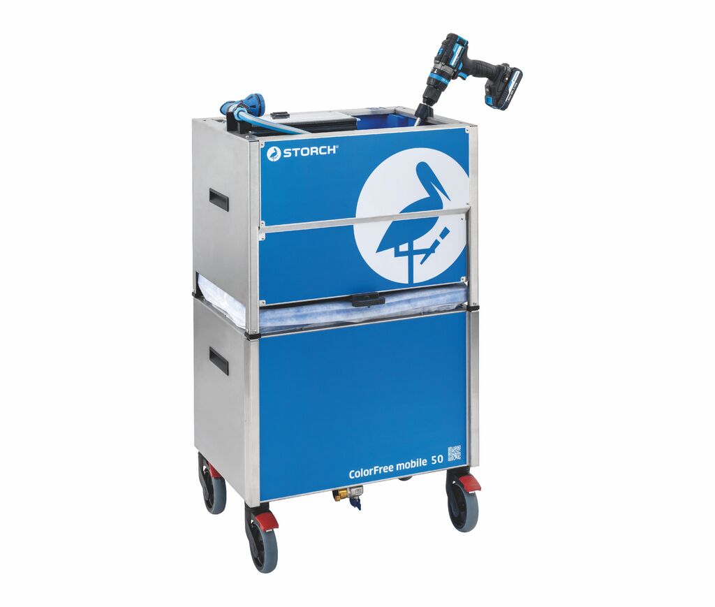 ColorFree mobile nabízí flexibilní řešení pro mobilní použití nebo malé dílny. S objemem 50 litrů, modulární konstrukcí složenou ze dvou jednotek vhodných pro přepravu a jednoduchým připojením k běžné domovní vodovodní přípojce je okamžitě připraven k použití – bez složité instalace. Díky kompatibilitě s akumulátorovými vrtačkami, například z řady 18 V, pracuje zařízení nezávisle na elektrických přípojkách. Nářadí se čistí přímo na místě, bez nutnosti vracet se do provozu. Celý proces čištění trvá přibližně 15 minut. To šetří čas, cestování a zajišťuje maximální produktivitu na každé stavbě.
